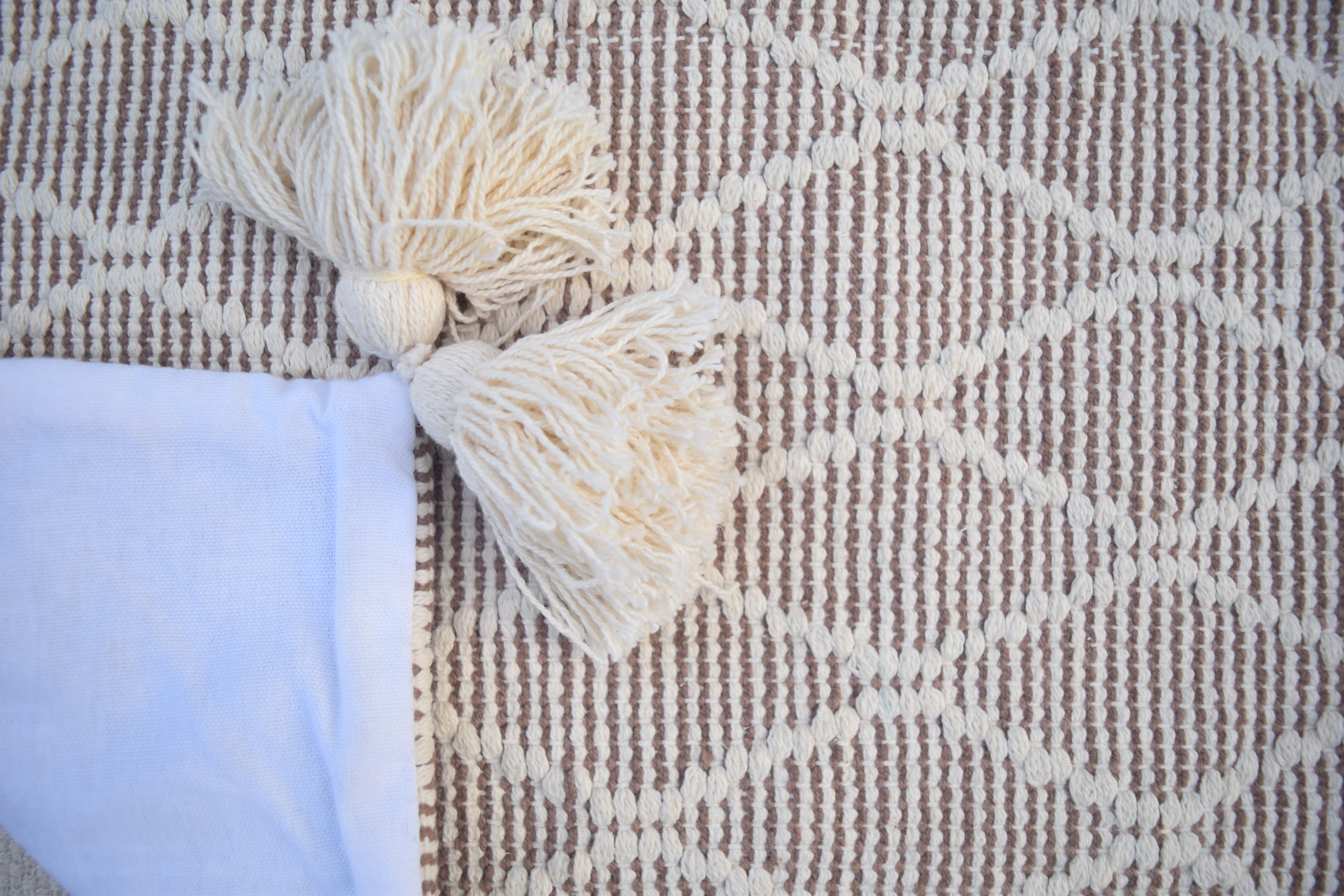 100 % de coton. Les coussins sont tissés selon un motif à 6 pagaies, les